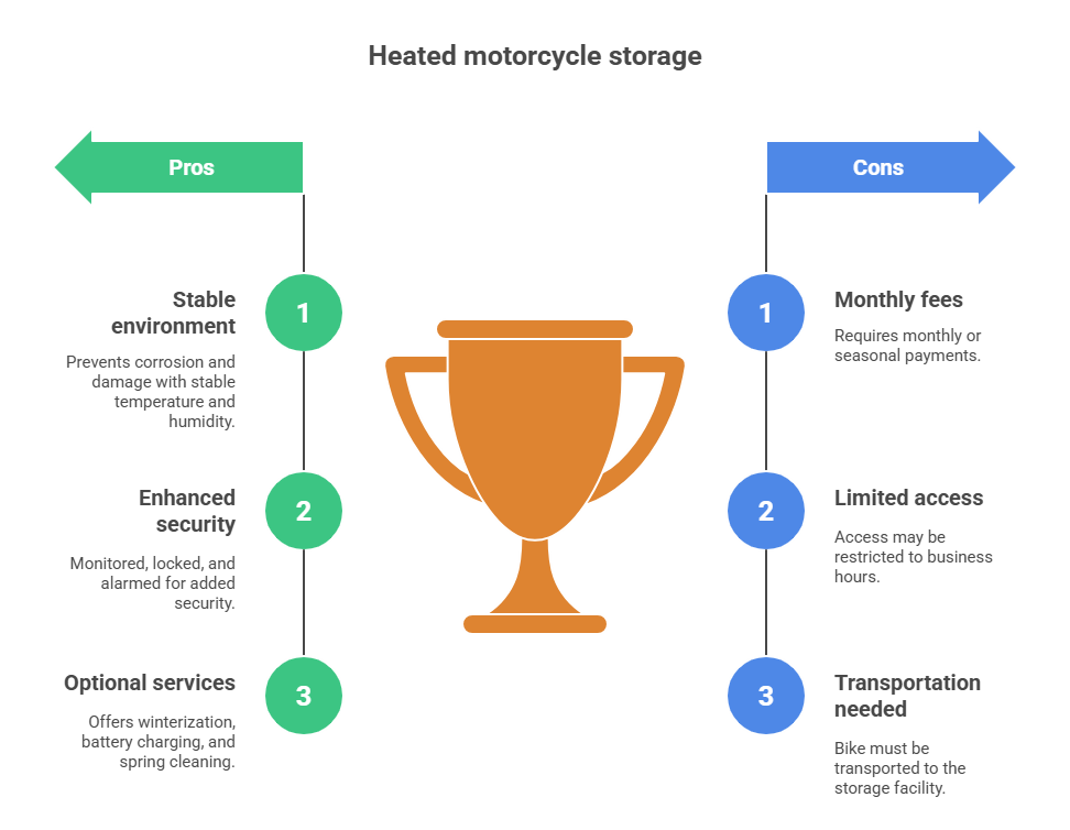 Heated storage keeps your bike in a stable environment, usually around 10 °C or higher, with low humidity. This prevents rust and keeps rubber, fluids, and electronics in top shape.